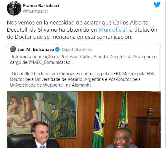 “Ele [Decotelli] cursou o doutorado, mas não finalizou, portanto não completou os requisitos exigidos para obter a titulação de doutor na Universidade Nacional de Rosario”, afirmou o reitor de Universidade argentina.